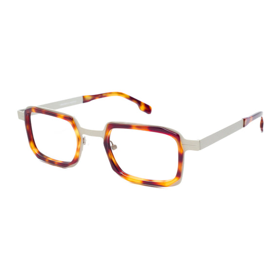 Material mixture of tan metal with tortoise acetate front. Take a look with our virtual eyeglass try on.