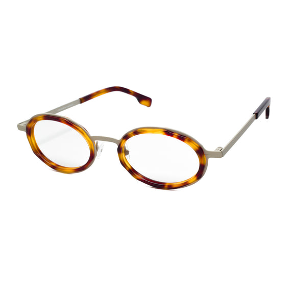 Material mixture of tan metal with tortoise acetate front. Take a look with our virtual eyeglass try on.